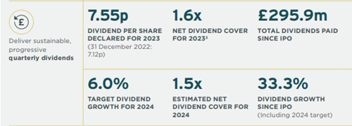 - Increasing the 2024 target dividend by 6.0% to 8.00 pence per share, reflecting over 30% growth since IPO.
